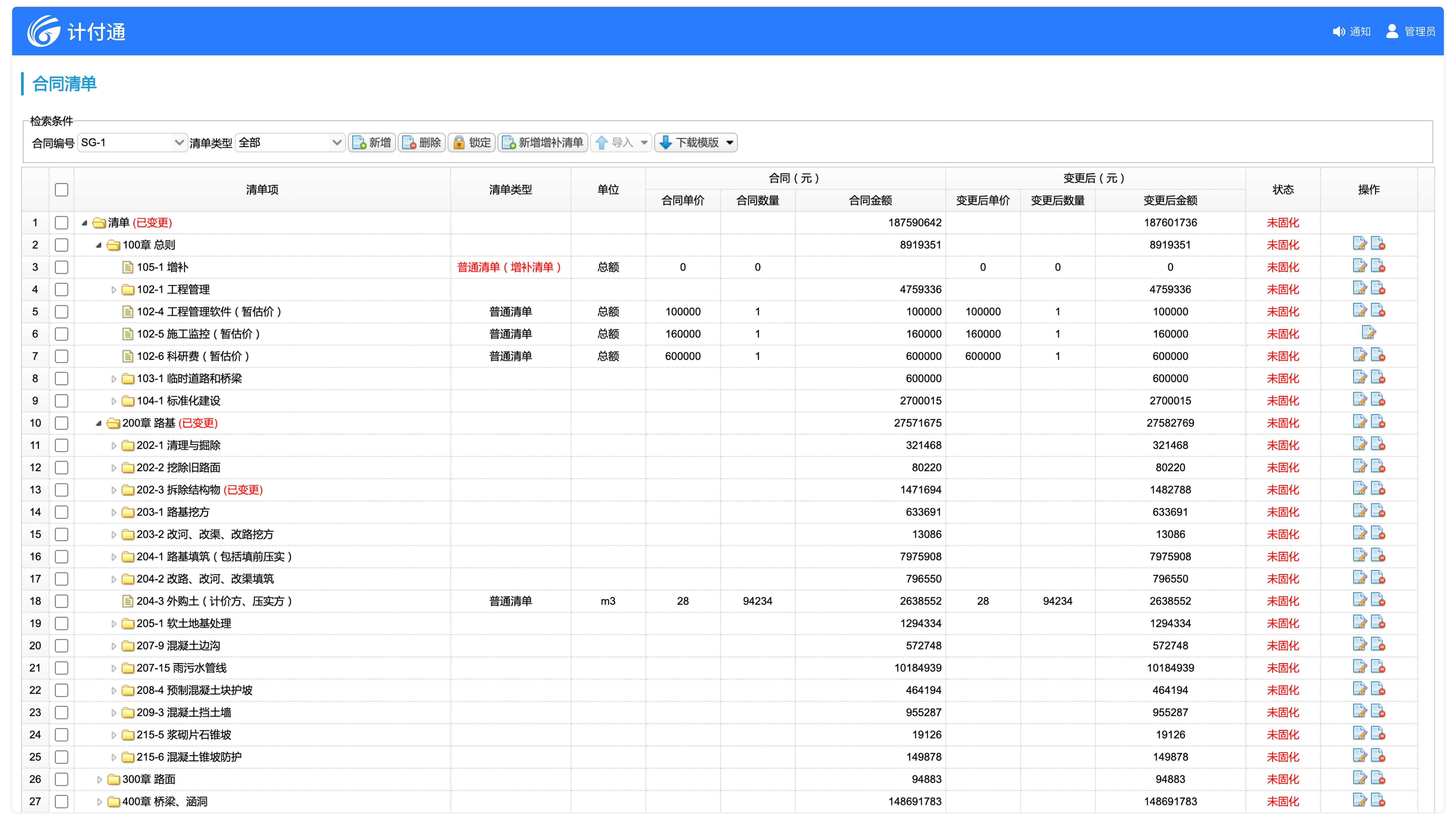 合同管理基本信息詳盡,約束條款中內(nèi)置各類計(jì)量依據(jù),是整個(gè)計(jì)量支付業(yè)務(wù)的源頭。
